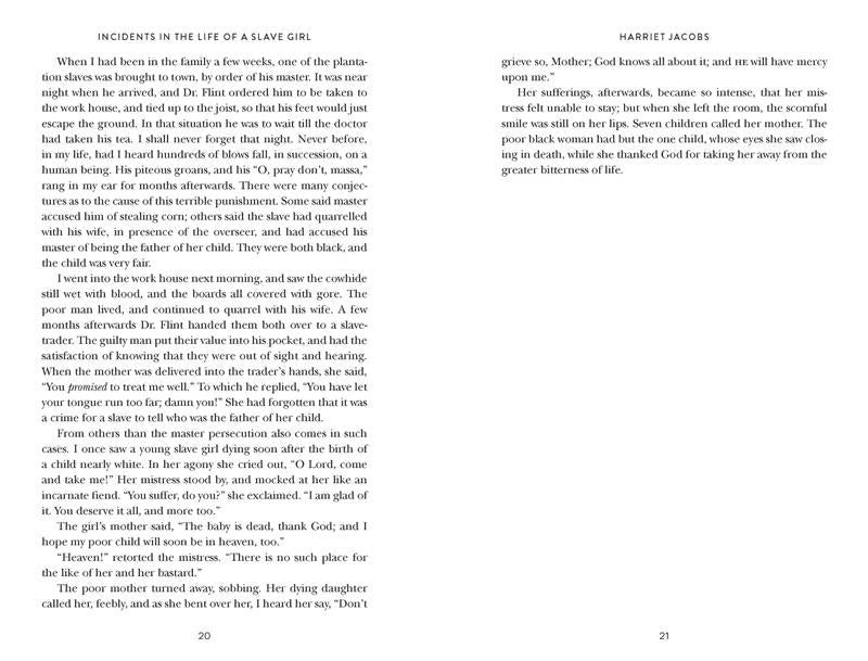 Harriet Ann Jacobs (1813-1897) was born in Edenton, North Carolina to Daniel Jacobs and Delilah, who were both slaves. Harriet inherited the status of both her parents as a slave by birth and was raised by Delilah until she died around 1819. She then was raised by her mother's mistress, Margaret Horniblow, who taught her how to sew, read, and write. After Margaret died, Harriet eventually escaped and took up residence in Rochester, New York, where much abolitionist work took place, and wrote Incidents in the Life of a Slave Girl.PRODUCT DETAILS