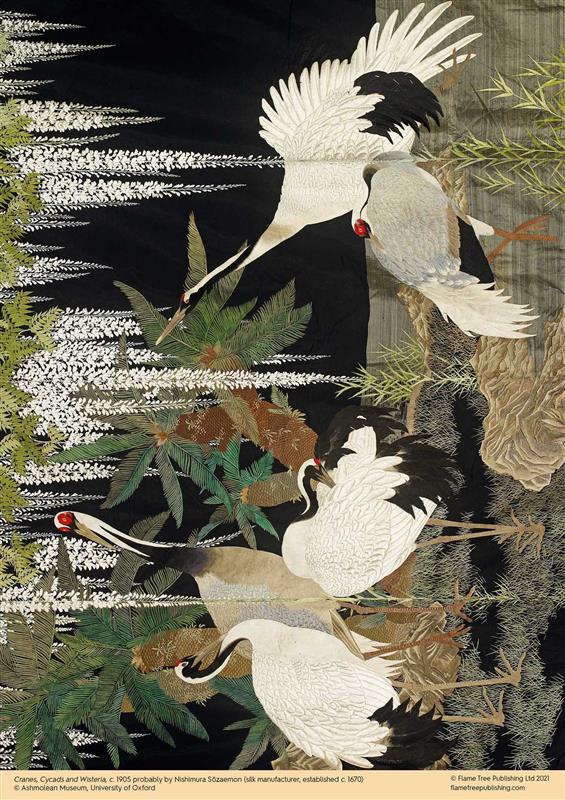 L' Ashmolean Museum est le musée d'art et d'archéologie de l'Université d'Oxford, fondé en 1683. Cette belle tenture a été offerte au musée Ashmolean en 1958 par Sir Herbert Ingram, qui s'est rendu au Japon lors de sa lune de miel en 1908. Dans la culture japonaise, la grue représente la bonne fortune et la longévité et est connue sous le nom de « l'oiseau du bonheur » - un sujet approprié pour un couple nouvellement marié.