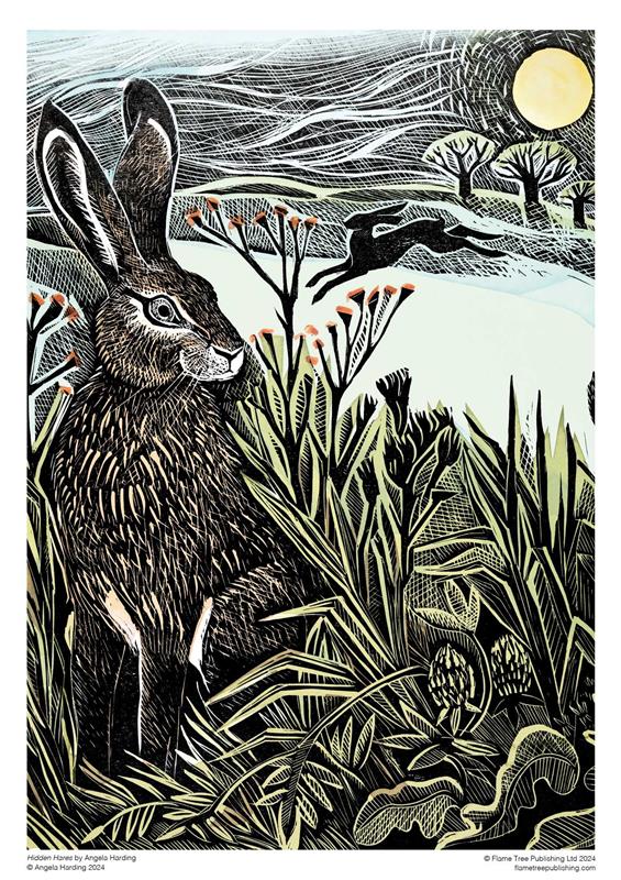 Angela Harding est une graveuse et illustratrice basée à Rutland, au Royaume-Uni. Elle est spécialisée dans les impressions sur linoléum et son travail s'inspire des oiseaux et de la campagne britanniques. Depuis de nombreuses années, elle a la chance d'être représentée par la Twenty Twenty Gallery, basée dans le Shropshire. Hidden Hares s'inspire du temps qu'Angela a passé au domaine de Knepp en 2022. Isabella Tree a écrit son livre à succès Wilding - co-écrit avec son mari et environnementaliste Charlie Burrell - sur ce merveilleux endroit. Il s'agit d'un projet de réensauvagement au cœur du Sussex visant à créer de nouveaux habitats naturels pour la faune. Angela Harding a réalisé une version illustrée du livre qui s'appelle également Wilding .