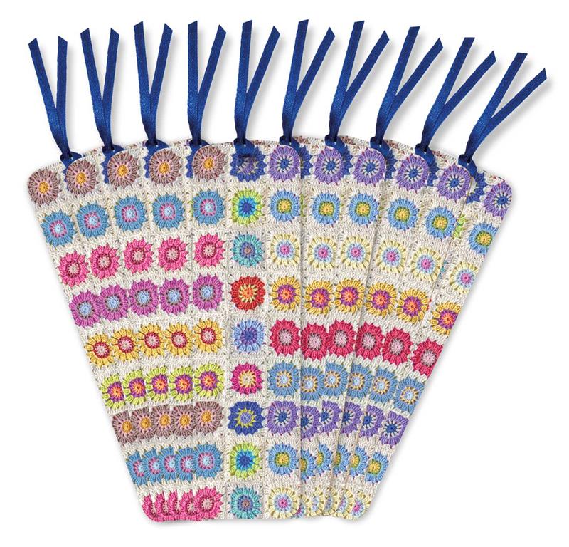 Sold in packs of 10. Keep the page in your book with this gorgeous foiled bookmark, printed on both sides, with a silky ribbon and featuring Aimee Stewart's Granny Squares design.