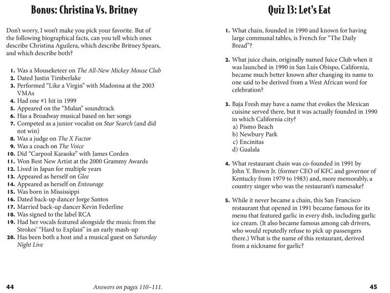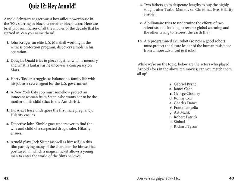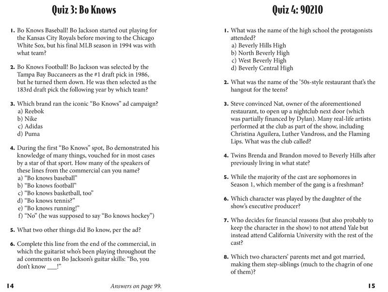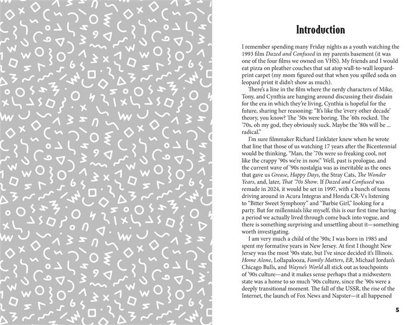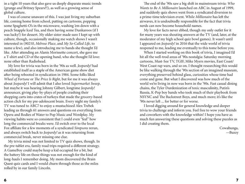 Buzzy Cohen, expert en jeux télévisés (et enfant des années 90), apporte toute sa connaissance des jeux télévisés pour ce regard nostalgique et déroutant sur la décennie qui nous a donné Britney et Christina, le soda clair, « Bo Knows », l'après-midi Disney et bien plus encore. La majeure partie du livre comprendra des quiz de plusieurs pages comprenant des questions de quiz standard, avec un mélange de questions à choix multiples et de questions ouvertes, certaines thématiques et d'autres offrant un mélange de quiz des années 90. En alternance entre ces quiz, un mélange de puzzles de quiz variés dans différents formats sera proposé, pour que l'expérience reste fraîche tout au long du livre.