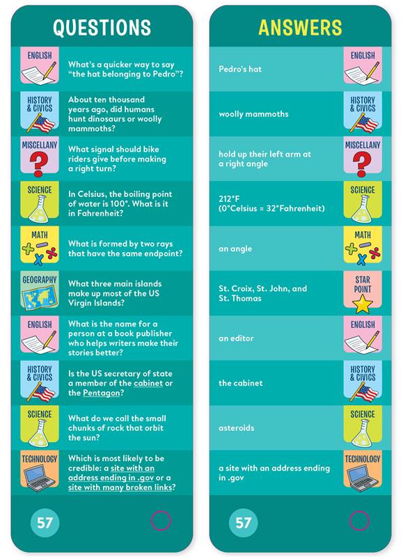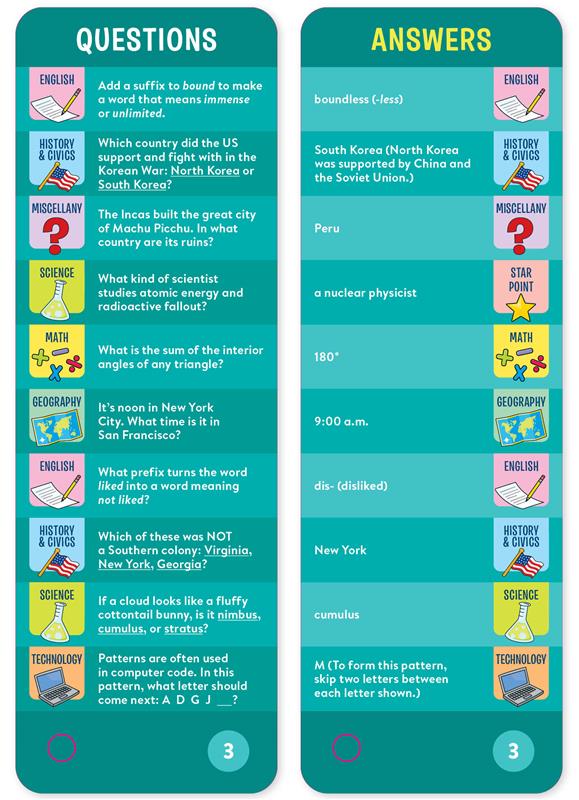 Les cartes à puce Brain Quest 5th Grade aident les enfants de 10 à 11 ans à apprendre les matières de base de la classe de manière intelligente, divertissante et engageante. Il s'agit d'un jeu de questions-réponses auquel les élèves de cinquième année peuvent jouer avec des amis, en famille ou contre la montre pour tester leurs connaissances. Les cartes à puce comportent des centaines de questions avec des réponses pour aider les enfants à savoir exactement ce qu'ils ont besoin de savoir, quand ils en ont besoin.