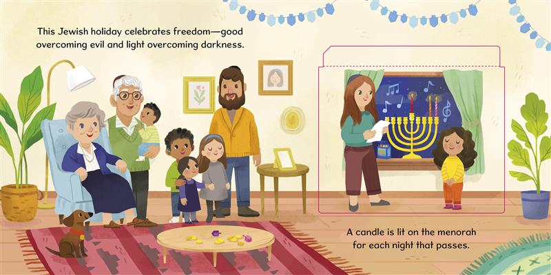 Also known as the Festival of Lights, Hanukkah is a beautiful holiday that takes place over eight nights. Featuring simple text, gorgeous illustrations, and satisfying lift-the-flaps, this book explores common Hanukkah traditions and helps young children understand the importance of this special holiday. Lift the flaps to reveal the menorah, look inside a synagogue, and see what yummy treats are being cooked in the kitchen.