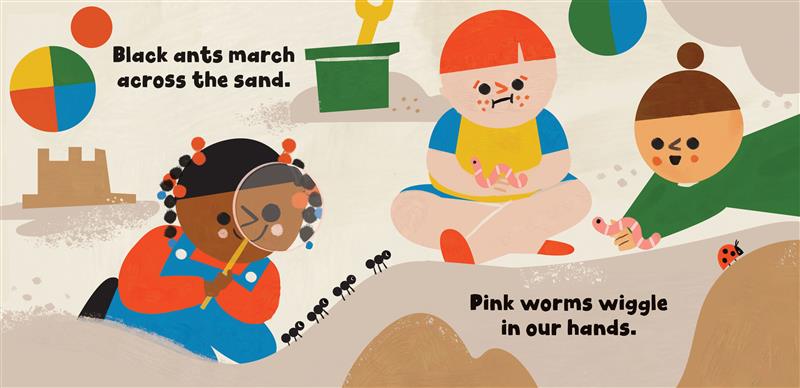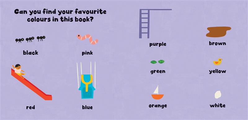 It’s time to head outside to play and look at the colours around us! There’s a red slide, black ants marching across the sand, and even brown mud pies. What other colours can you spot?
