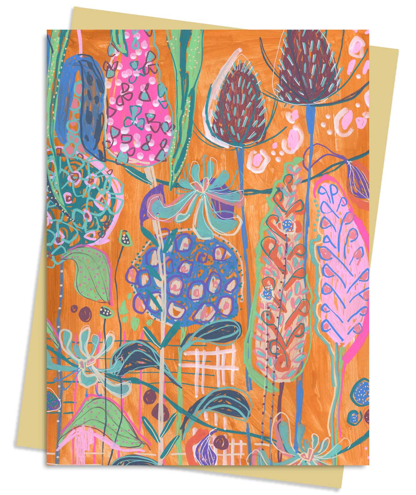 Vendues en paquets de 6. Superbes cartes de vœux faites à la main, avec feuille d'or, vierges à l'intérieur et emballées sous film rétractable avec une enveloppe dorée. Sur le thème de nos calendriers d'art, de nos carnets de notes avec feuille d'or et de nos livres d'art illustrés, nos cartes de vœux sont imprimées sur du papier certifié FSC® et emballées dans un sac cellophane biodégradable. Cet exemple présente la riche œuvre à la gouache de Lucy Innes William , Orange Hydrangeas .