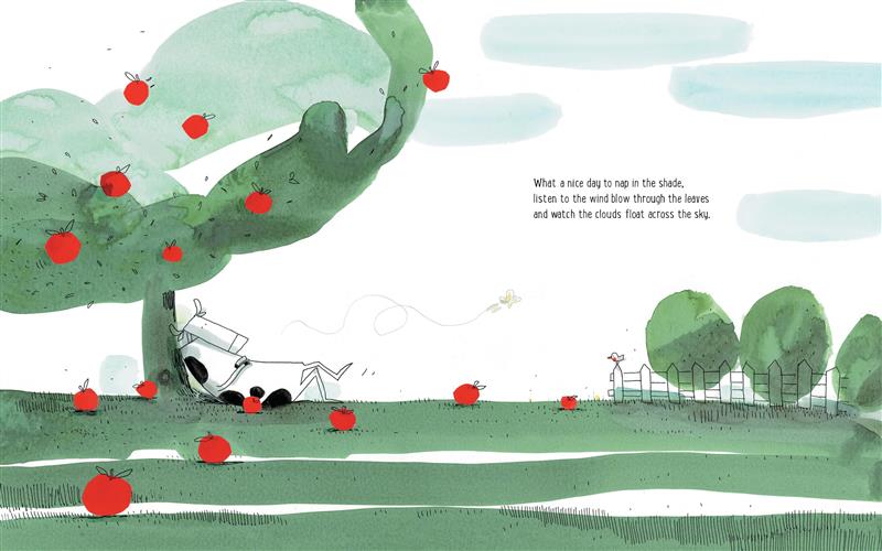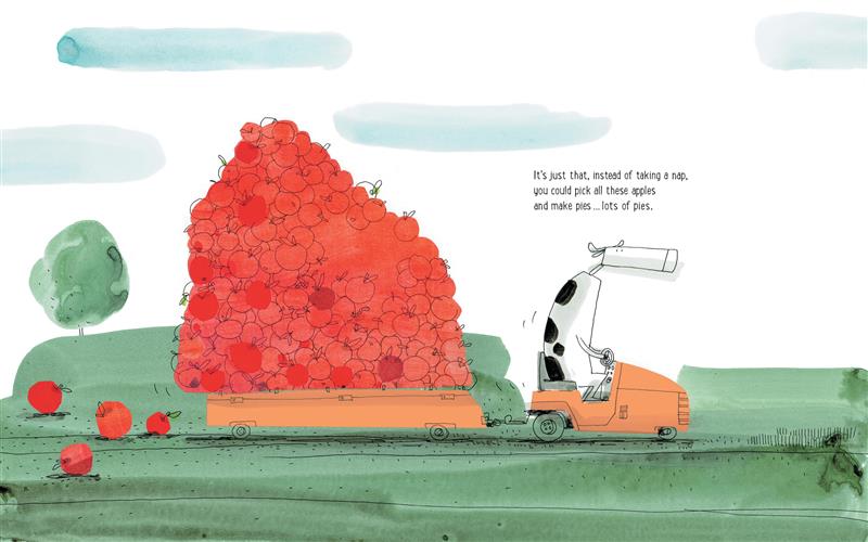 Cow enjoys lying in the shade of her apple tree, listening to the wind blow through the leaves and watching the clouds float across the sky. Looking at all the apples on the tree, Pig begins to spin an elaborate and ever-expanding tale about how Cow could sell the apples, make pies and applesauce and sell those too, plant more trees, and on and on ... Soon, Cow could have a multinational food company and become the richest cow in the world! Cow listens patiently to Pig's grand ideas. But what comes next after fame and fortune? Cow shows Pig that she's got a much better plan.