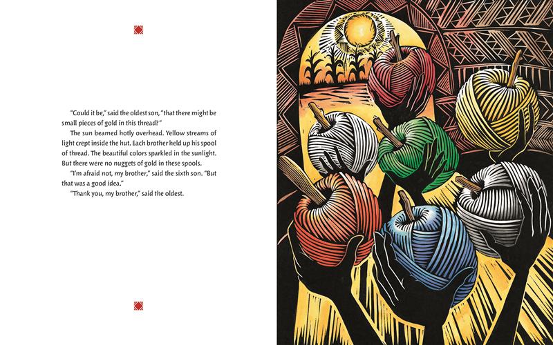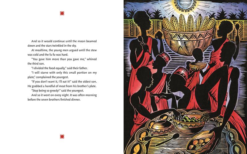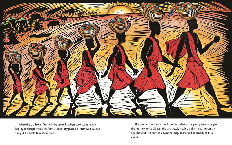 In an African village live seven brothers who make family life miserable with their constant fighting. When their father dies, he leaves an unusual will: by sundown, the brothers must make gold out of seven spools of thread. If they fail, they will be turned out as beggars. Using the Nguzo Saba, or "seven principles" of Kwanzaa, the author has created an unforgettable story that shows how family members can pull together, for their own good and the good of the entire community. Magnificent and inspiring linoleum block prints by Daniel Minter bring joy to this Kwanzaa celebration.