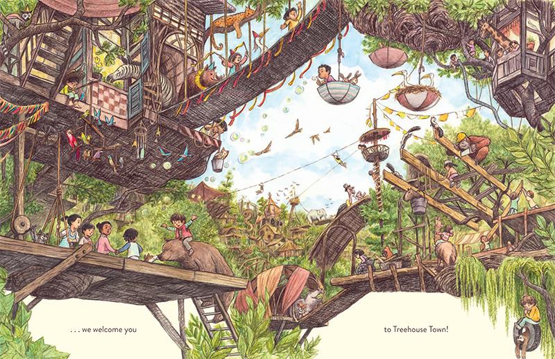 Promenez-vous dans le bazar aux bouleaux, montez à bord du train des tulipes, explorez la bibliothèque dans les pruches ou jouez au birdball dans le ciel. Il y en a pour tous les goûts à Treehouse Town, un monde construit par des enfants aussi infini que leur imagination.