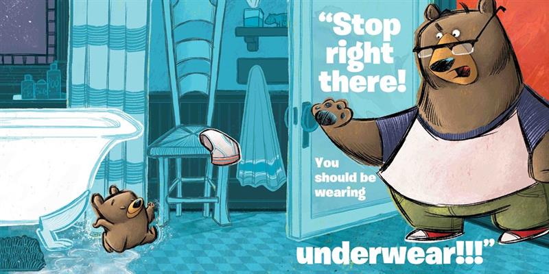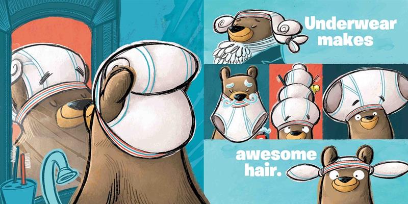 Ainsi commence le dialogue entre un papa ours fatigué et un ourson turbulent qui préfère jouer avec son caleçon moulant plutôt que d'aller au lit. Les sous-vêtements font de beaux cheveux. Ils peuvent même transformer quelqu'un en un superbe ours, ou en un ours nageur portant des lunettes de natation. Mais attention à la grosse frayeur ! Les rimes, les homonymes et les conjonctions abondent dans ce livre qui pourrait être utilisé pour apprendre à lire, mais son objectif principal est de rendre l'heure du coucher amusante.