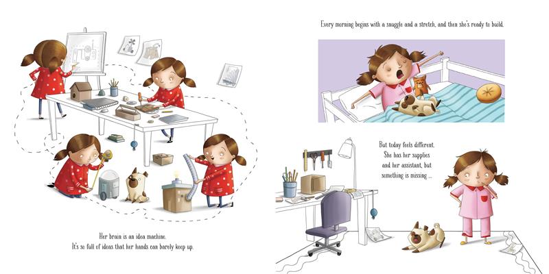 The girl in this story, with her dog at her side, loves to make things. Her brain, she says, is an “idea machine,” so full of ideas that she can hardly keep up. But then one day ... it isn't. All of a sudden, the girl can't come up with a single idea for what to make. She tries everything: brainstorming, gathering new supplies, even jumping up and down on one foot to shake an idea loose. But, nothing. The girl realizes, with no ideas taking up space in her brain, it's filling with sad instead. What if she never has another idea again?