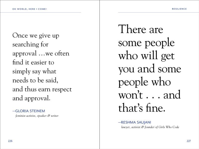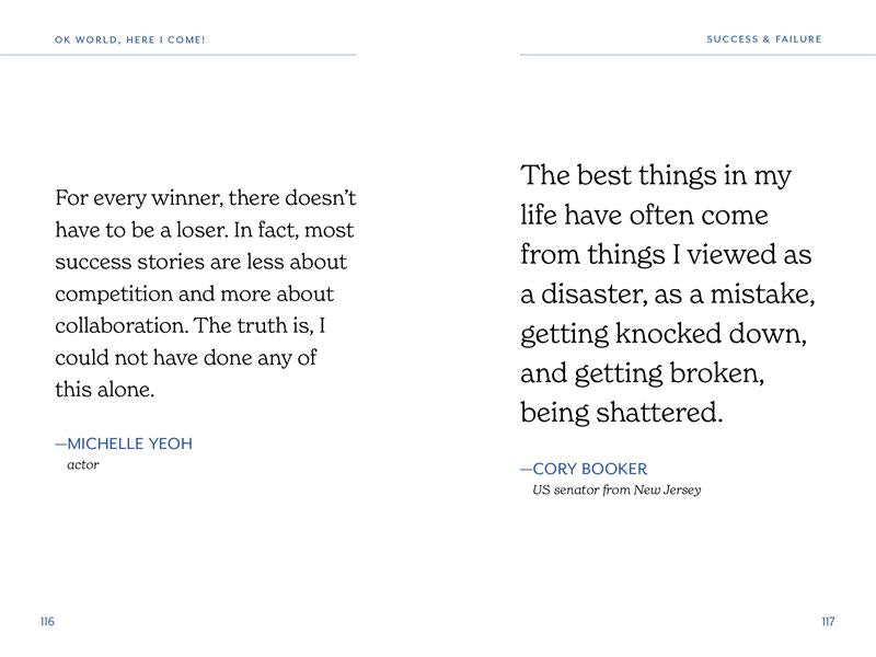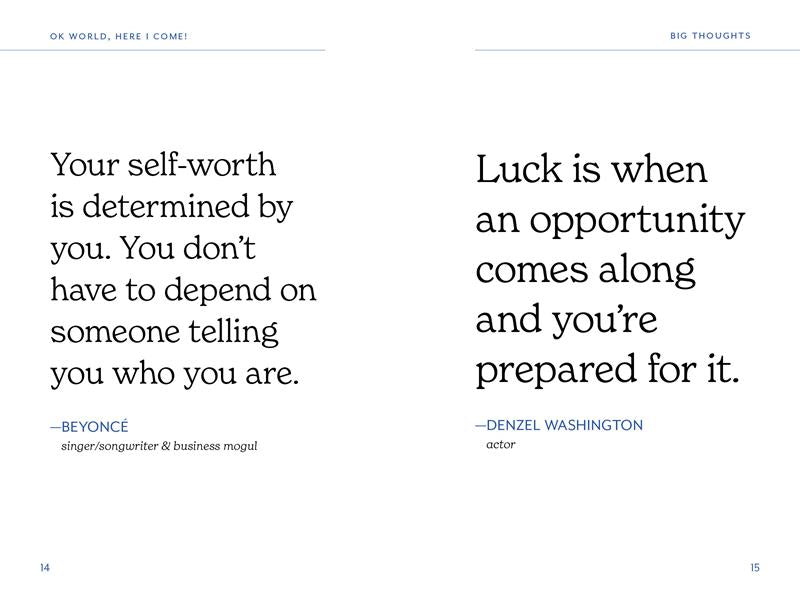 OK, World, Here I Come! is an invaluable book for graduates as they launch into the next chapter of life. Organized by themes such as Self-Care, Success & Failure, Work Ethic, and more, each quote is carefully selected to evoke confidence, motivation, and encouragement for the reader.