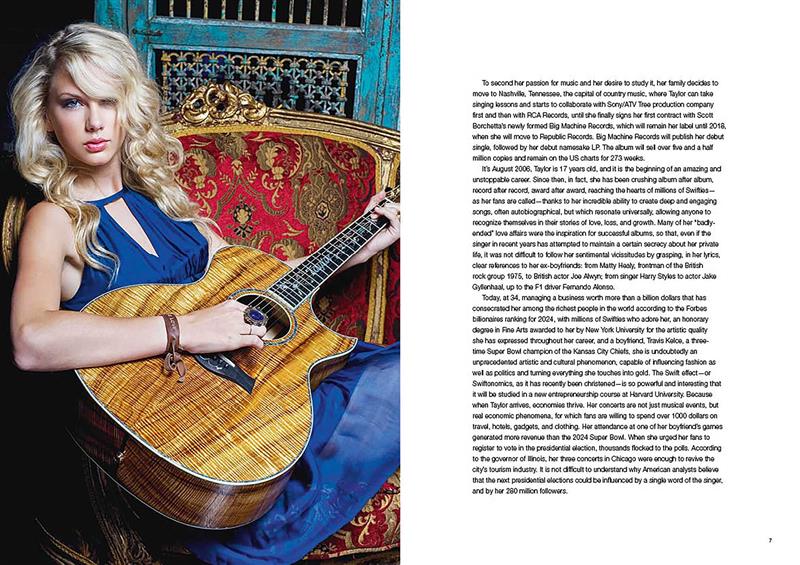A global phenomenon that appeals across generations, recounted in an informative book, enhanced by carefully selected photographs and a large-format poster. Much more than a music superstar, Taylor Swift is a true cultural phenomenon, evolving from a young country promise to a global pop icon. With her unique storytelling style and spectacular live performances, Taylor Swift has captured the hearts of millions of fans of all ages, telling stories of love, pain, and personal growth that resonate universally. "The Tortured Poets Department", her eleventh and latest album was released in April 2024, and downloaded over two hundred million times in 12 hours on Spotify alone. From the cover of Time to the Grammy Awards to conquering the American Top Ten with 5 albums (a feat that before her only Prince had managed to accomplish in the days following his death), Taylor Swift continues to rack up awards and recognition, dominating the charts, and the hearts, of her many fans.